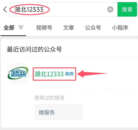 第一步:微信搜索“湖北12333”,点击【湖北12333(政府)】小程序,进入小程序后点击左下角“微服务”。
