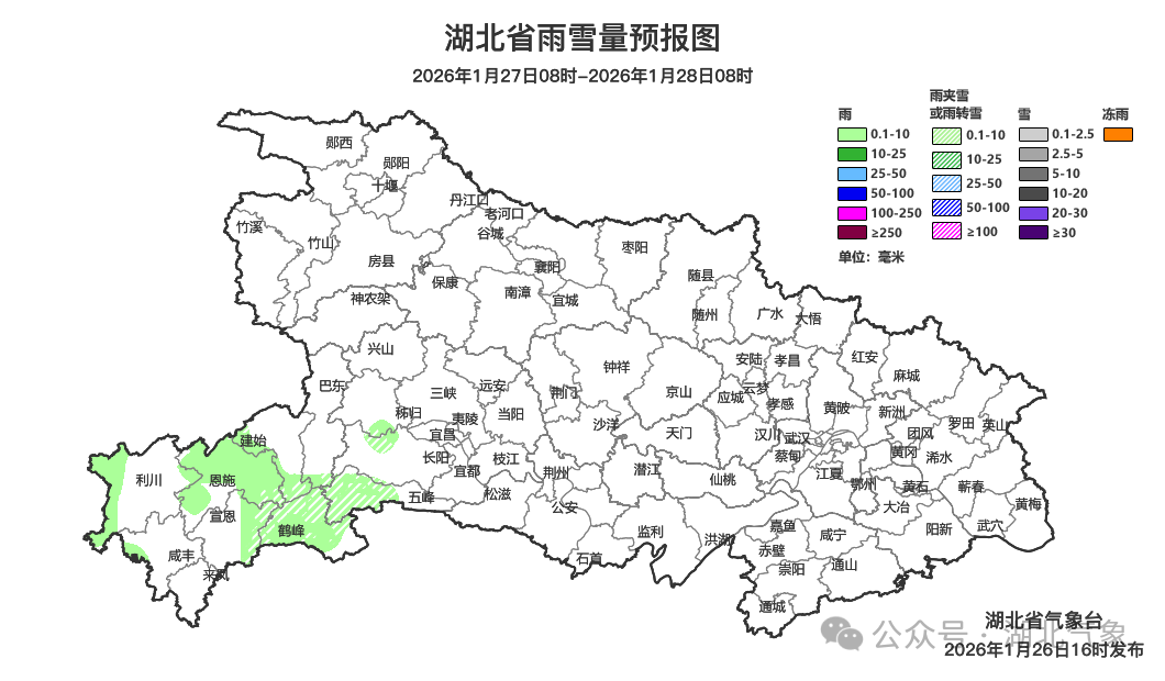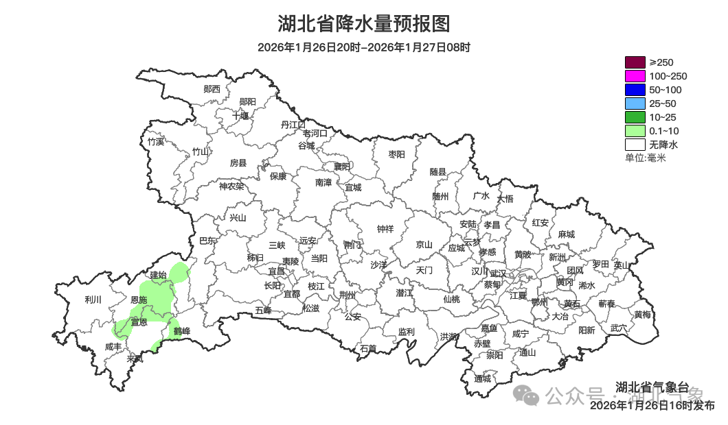 1月26日20时-27日08时,恩施地区阴天,局地有零星小雨;其他地区多云。省内中东部地区有霾。最低气温鄂西北-2~0℃、其他地区0~5℃,偏北风2到3级。