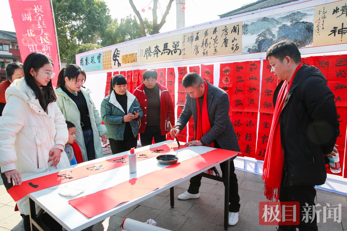 活动现场,歌曲《这就是竹山》、书画+太极《骏马春风意 墨舞竹山春》、诗词情景剧《木兰辞》等特色节目轮番上演,将经典诗词与竹山人文底蕴深度融合;“飞花令”“诗词接龙”等互动环节趣味盎然,吸引群众踊跃参与;县书画家协会会员现场写送春联、创作书画长卷,以墨香传递新春祝福;广场两侧,2026年年货节摊位上同样热闹非凡,寿康永乐竹山超市的日常百货与该县17个乡镇的农特产品集中展销,吸引众多市民围观选购。