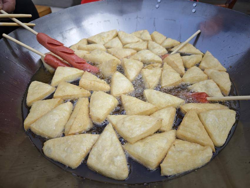 主妇们皆是制作炸豆腐的好手,待油烧至滚烫时,切好的豆腐块下锅瞬间,便开启了奇妙的蜕变之旅。洁白的豆腐在油锅中渐渐鼓起,色泽由白转金,外皮变得酥脆紧实,内里却依旧嫩滑多汁,出锅沥干后,金黄夺目、香气扑鼻,光是看着便让人垂涎欲滴。大人专注炸制豆腐,馋嘴的小孩子悄悄取来几根香肠下入油锅,趁着热油烹炸的间隙静待美味,待香肠飘香出锅,便满心欢喜地品尝起来。