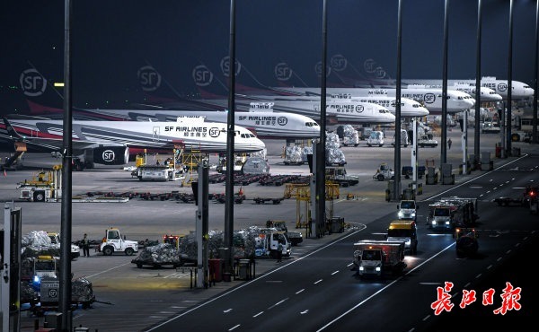 凌晨的花湖机场灯火通明,停机坪上一片繁忙景象。