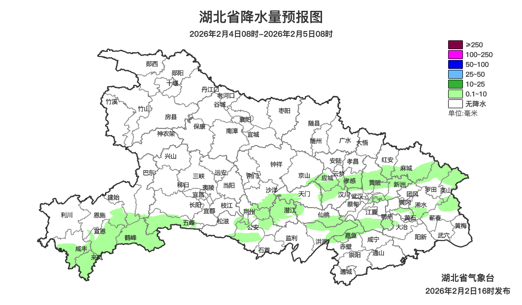 2月5日08时-6日08时,鄂西南南部、江汉平原南部、鄂东北东部、鄂东南阴天有小到中雨;其他地区阴天有小雨。夜间鄂西北、鄂西南、鄂东北北部高海拔地区有雨夹雪或雪。最高气温恩施地区9~13℃、其他地区14~19℃,最低气温北部-1~4℃、南部4~9℃,偏南风转偏北风2到3级。