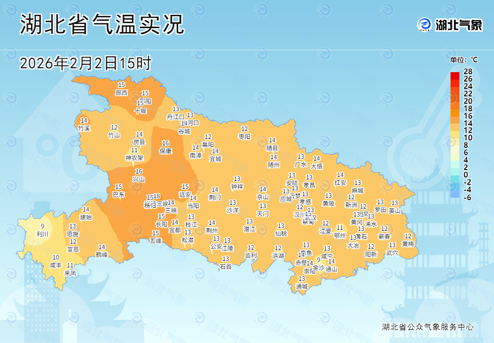2月4日08时-5日08时,全省多云到阴天,其中鄂西南、江汉平原、鄂东北、鄂东南局地有零星小雨。最高气温恩施地区9~13℃、其他地区14~19℃,最低气温北部-1~4℃、南部4~9℃,偏南风转偏北风2到3级。