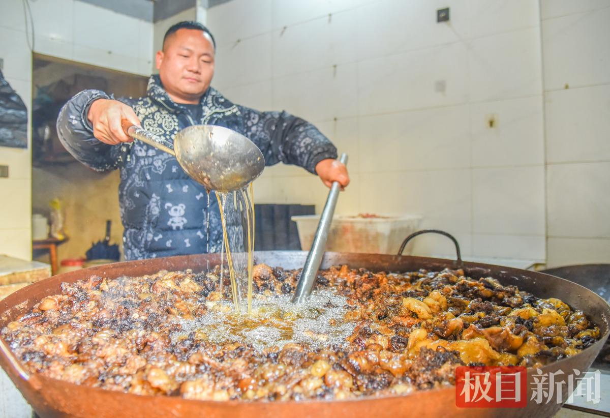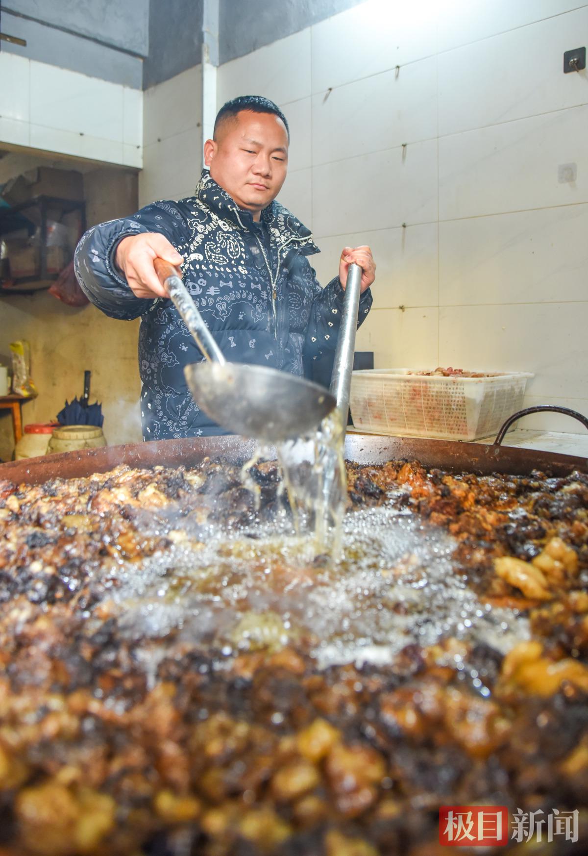 刘杨在公安县城一家连锁店熬制牛油(极目新闻记者 黄志刚 摄)