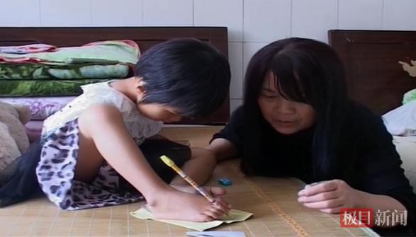 刘德芬在辅导一名无臂儿童用脚趾写作业(视频截图)