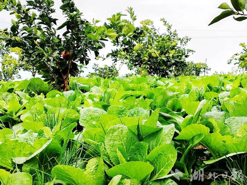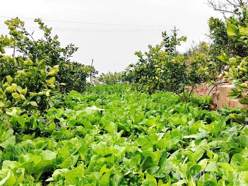 在日常的柑橘管理中,朱前清看到柑橘林空隙地里杂草长得特别快,每年要花大量的精力锄草。后来他发现,果树能当天然遮阳伞,林下湿度大、土壤肥,种蔬菜正合适。朱前清眼睛一亮,当即决定尝试“林菜间作”——在柑橘树的行间,套种白菜、油菜、葱苗等短期蔬菜。他介绍说:“蔬菜生长期短,赶在柑橘管护闲季就能收获,不耽误果树照料。”
