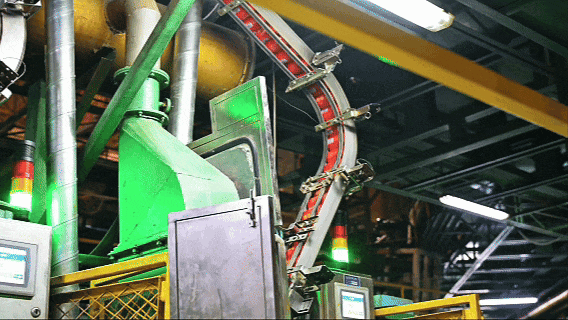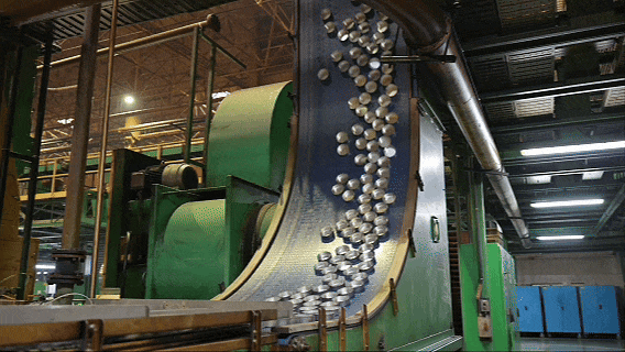 车间内,两条全自动高速生产线,正在进行这一场肉眼难以捕捉的“极速运转”,巨大的铝卷被缓缓送入前端,在强力的冲压声中,瞬间变身为一只只银色的杯体——这便是易拉罐的起点。