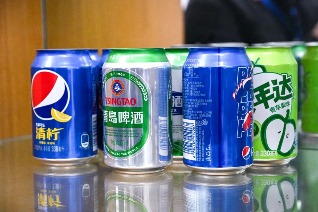 随后,这些铝杯在传送带上汇成一道银色河流,经过覆膜、喷涂等多轮环节,转眼间,青岛的绿、百威的红、百事可乐的蓝……各种色彩斑斓的品牌图案便“跃”然罐上。