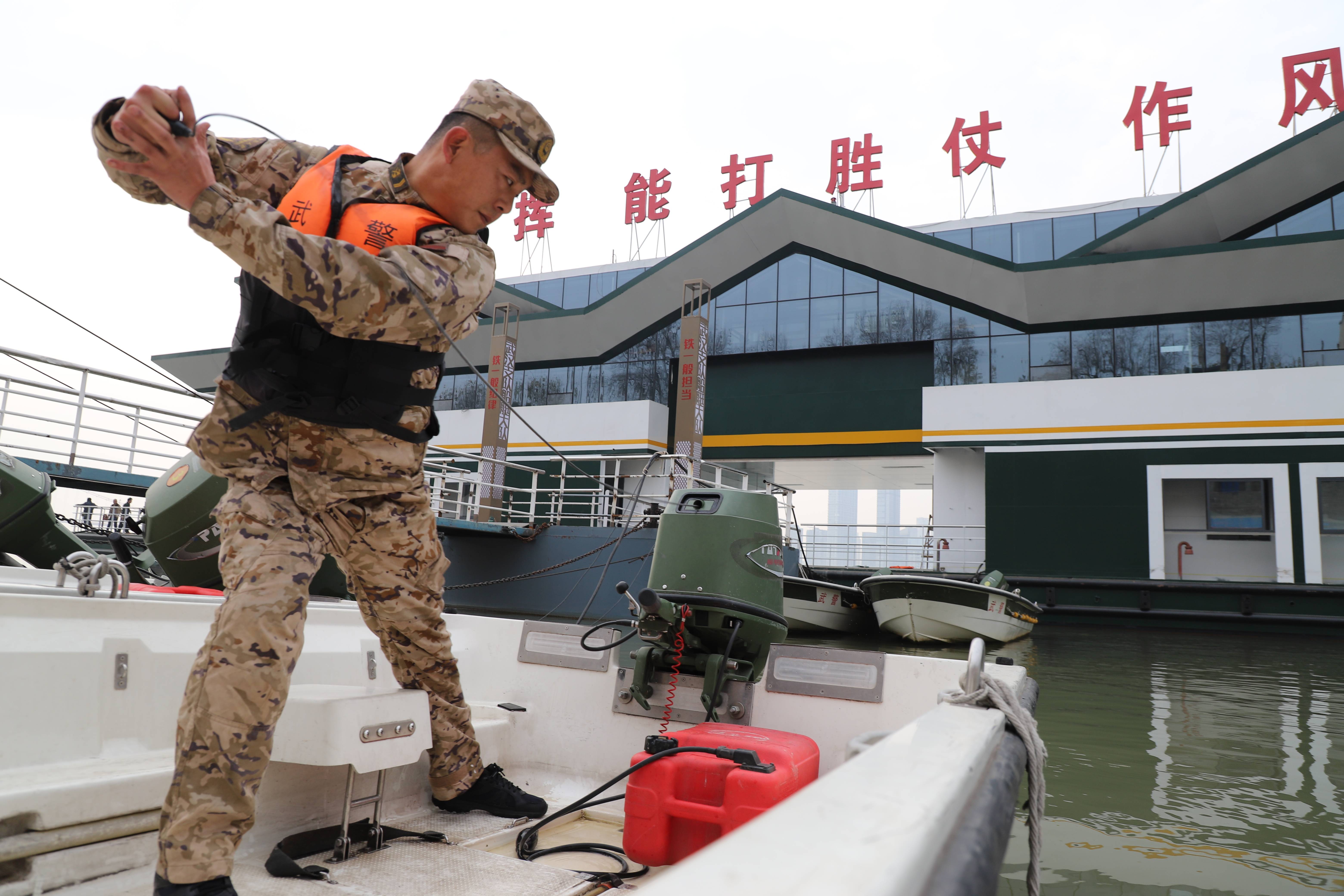 在武警湖北总队武汉支队船艇大队某战位,训练器材摆放整齐,几名官兵正开展水上救援演练。