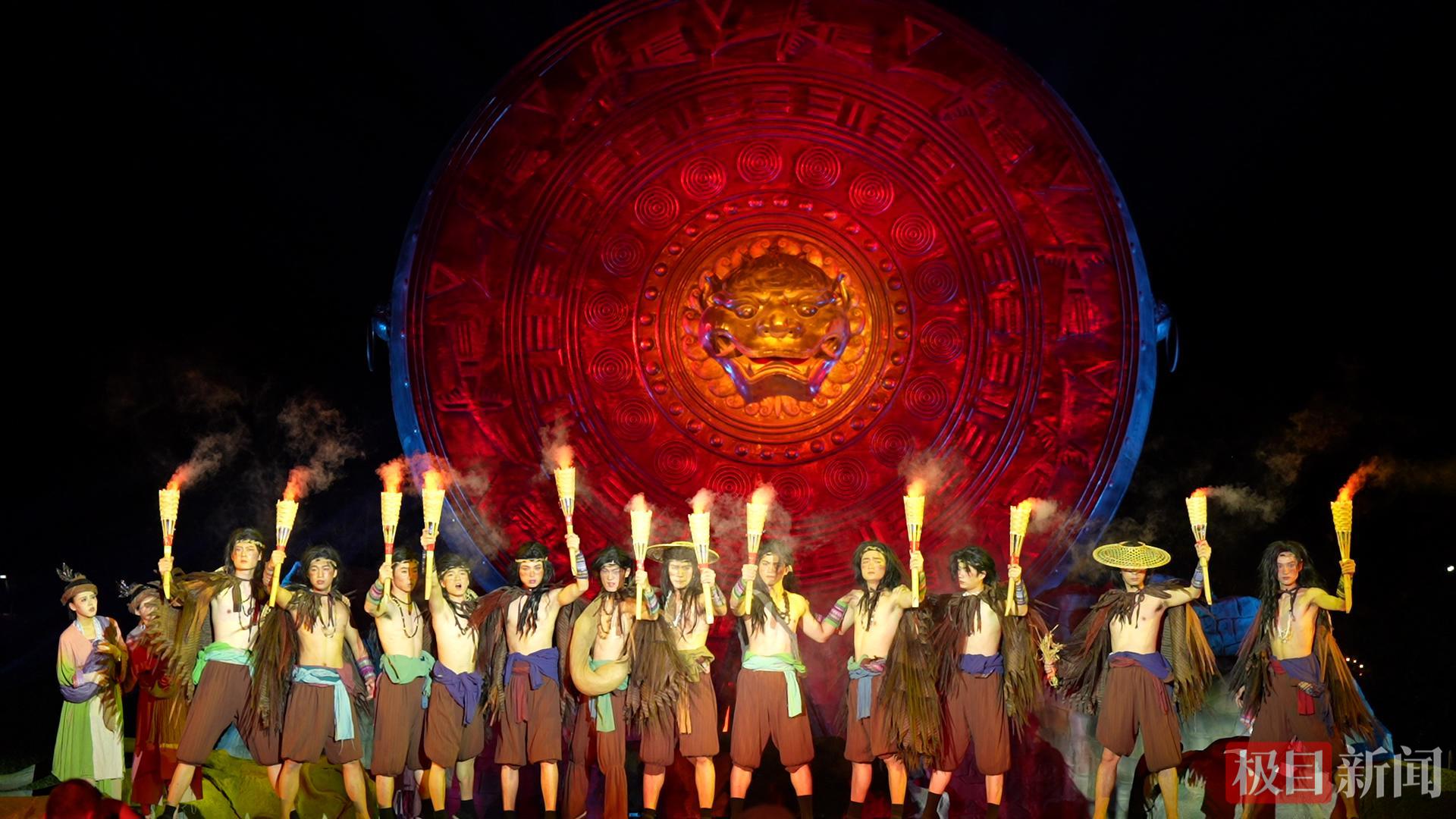 到了夜晚,篝火晚会上载歌载舞,游客可以在云歌剧场里体验《瑶望千年》实景剧,光影、威亚、烟雾等特效拉满,沉浸式感受古瑶的迁徙与生活。
