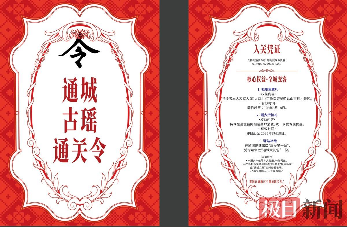 据徐摇介绍,过年期间,为回馈游客,通城县还诚意推出了1000份“古瑶通关令”,下高速口即可在服务点领取。这不仅是一份具有收藏价值的文化文牒,更是通城献给游客的一份“宠客大礼包”。凡持有“古瑶通关令”的游客,可尊享全县所有收费景区(含药姑山古瑶村、高冲公社等)大门票全免的特权。同时,全县涵盖餐饮、住宿、特产的金牌商户已集结完毕,承诺为持证游客提供统一8.8折的专属优惠。该政策将从即日起持续生效至3月18日,旨在通过“全城免票、全城让利”,邀请全国游客来通城过一个最有诚意、最地道的瑶家年。
