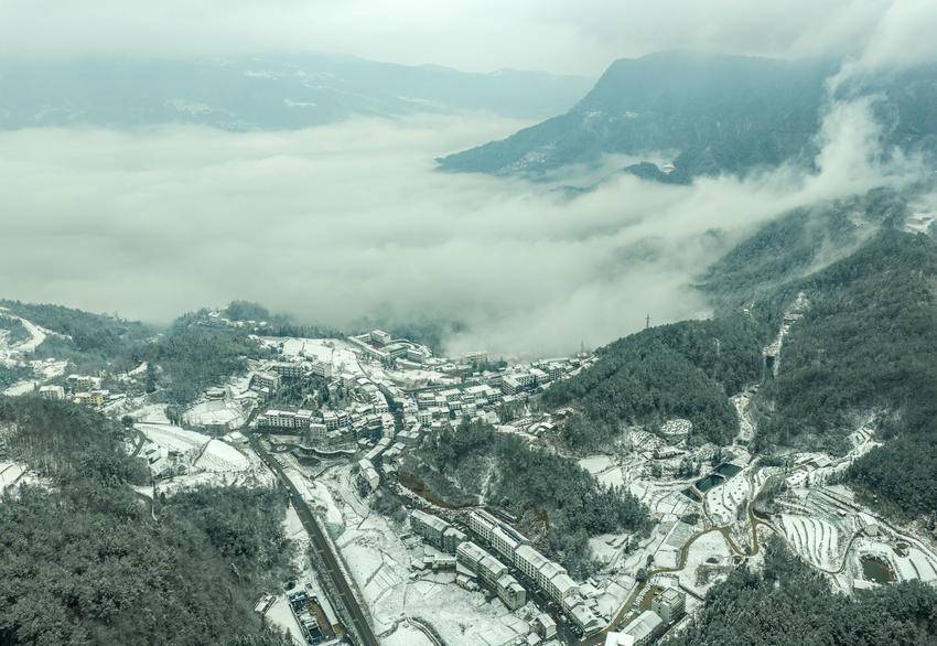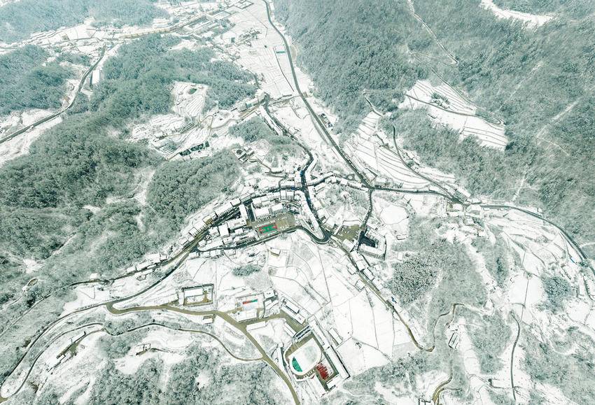 图为2月9日,湖北省秭归县磨坪乡,瑞雪覆盖美丽村庄(无人机照片)。