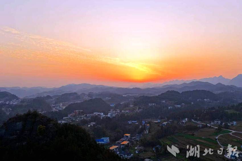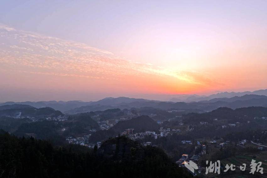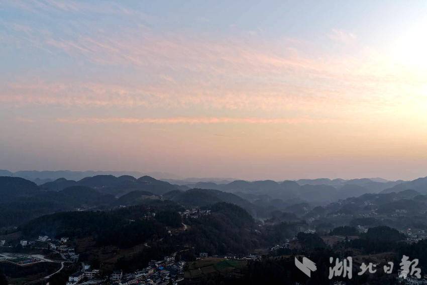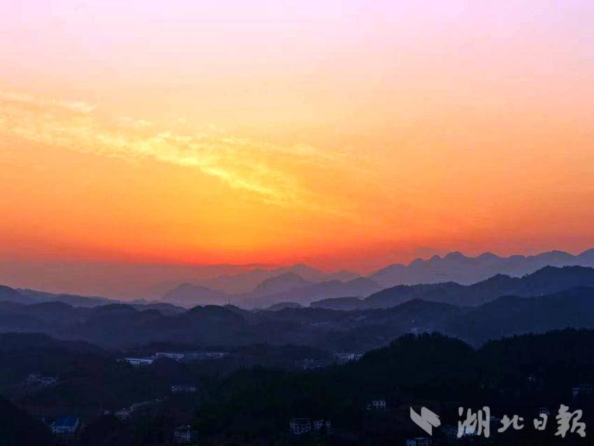 湖北日报客户端讯(通讯员施维、胡自丹)2月10日傍晚,大堰社区上空铺展出一幅绚丽霞光图景。橙红与粉紫交融的天幕下,流云如丝,将连绵群山勾勒得层叠如画。