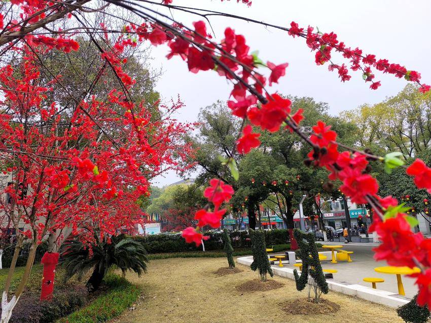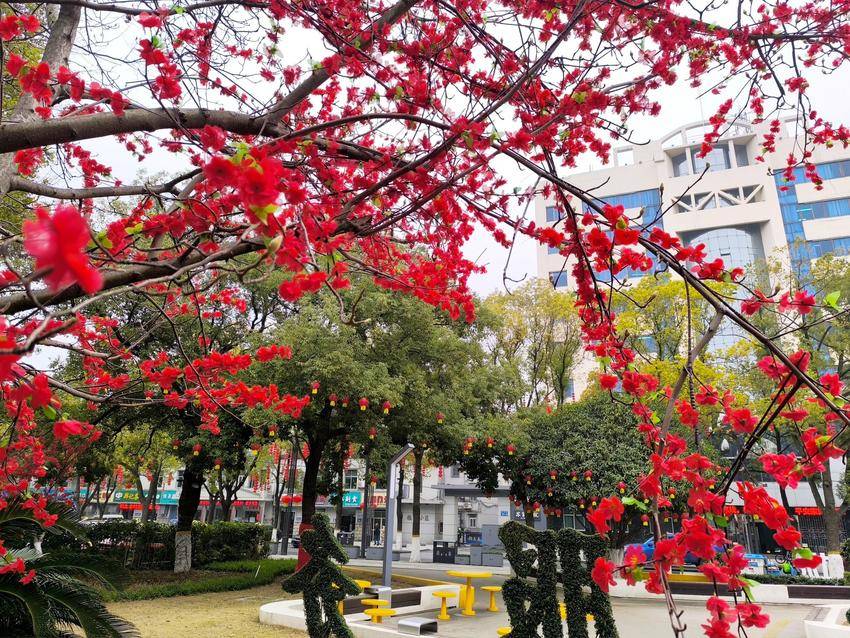 湖北日报客户端讯(通讯员刘语桐、刘孜孜、柳月)在三峡水乡、锦绣枝江的大礼堂广场边,鲜艳的红梅像燃烧的火焰,点亮了初春的眉眼。一树红花,在还有些清冷的晨风中摇曳生姿,每一朵都似精心雕琢的艺术品,薄如蝉翼的花瓣,娇艳欲滴的色泽,让人忍不住心生欢喜。它们不管不顾地绽放着,用最热烈的色彩,驱散了冬日残留的最后一丝寒意。
