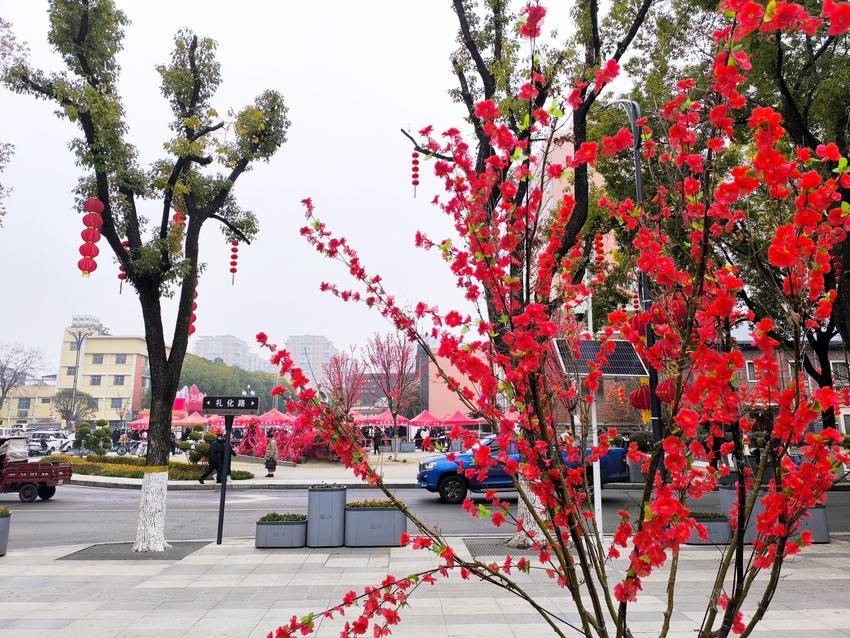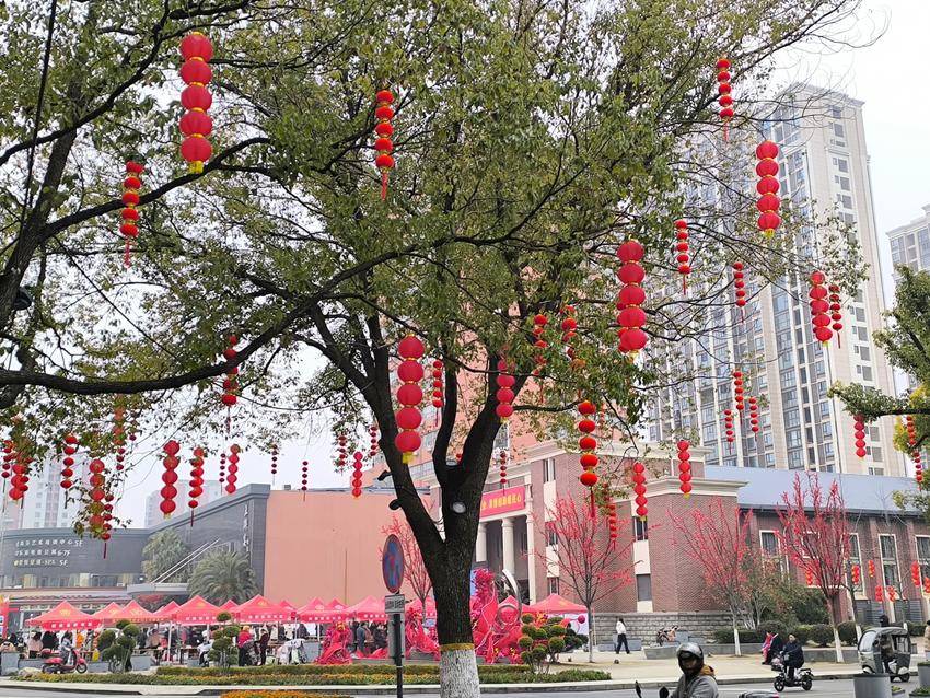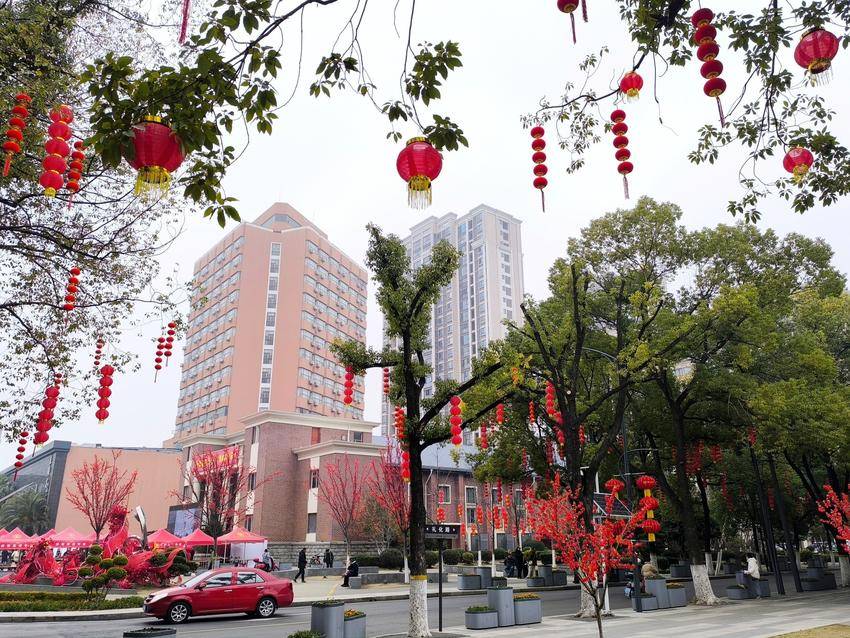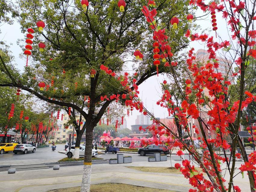 远处,街道两旁的树木上挂满了红灯笼,那一抹抹鲜艳的红,顺着蜿蜒的街道延伸开去,仿佛是大地与天空之间的一条红色纽带。红灯笼在微风中轻轻晃动,像是在低声诉说着对新岁的期盼。它们与红梅的红相互映衬,构成了一幅绝美的画卷,让整个城市都沉浸在浓浓的喜庆氛围之中。