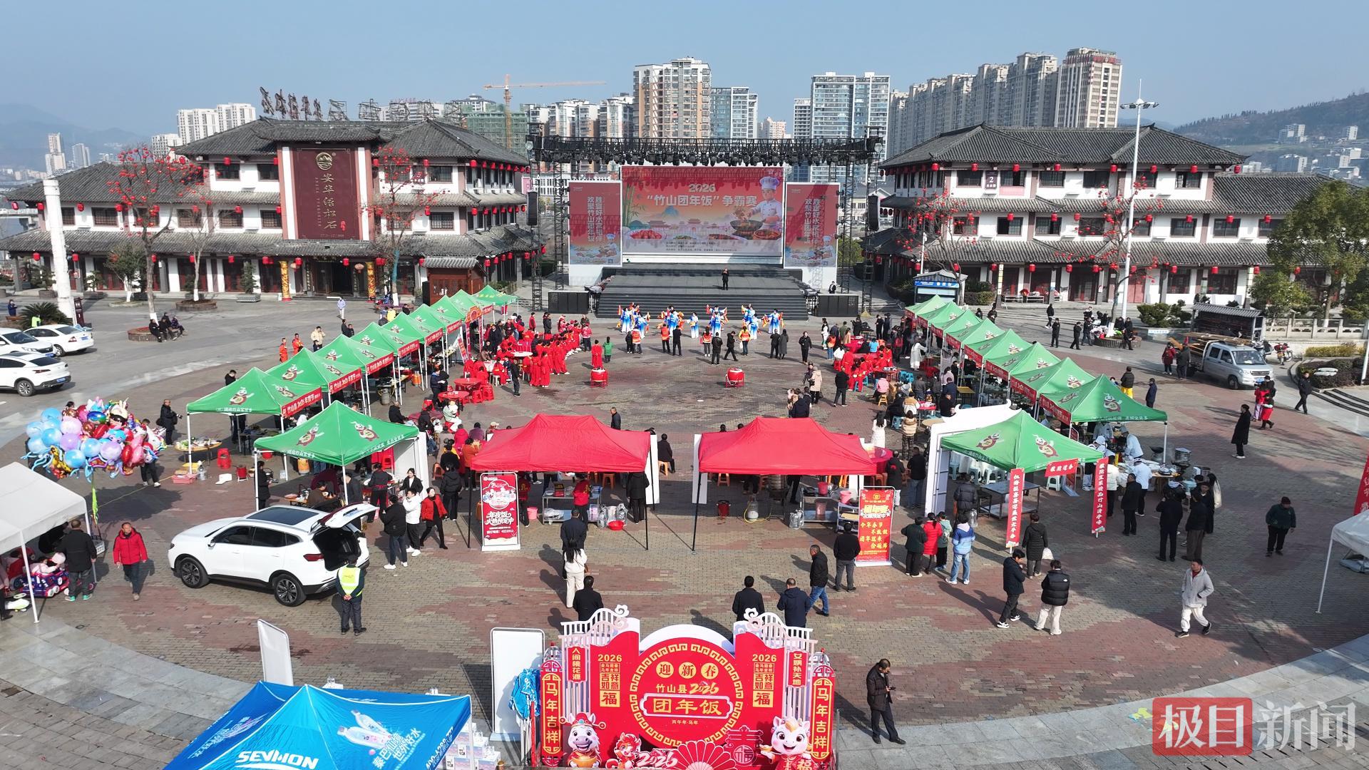 腊月二十三,农历小年,湖北竹山县桃花源街区女娲文化广场人声鼎沸、香气弥漫。2026年“竹山团年饭”争霸赛在此拉开帷幕,来自全县17个乡镇的代表队及4家餐饮企业同台竞技,以一道道饱含乡情与匠心的团圆宴席,点燃了竹山人民喜迎新春的热情。
