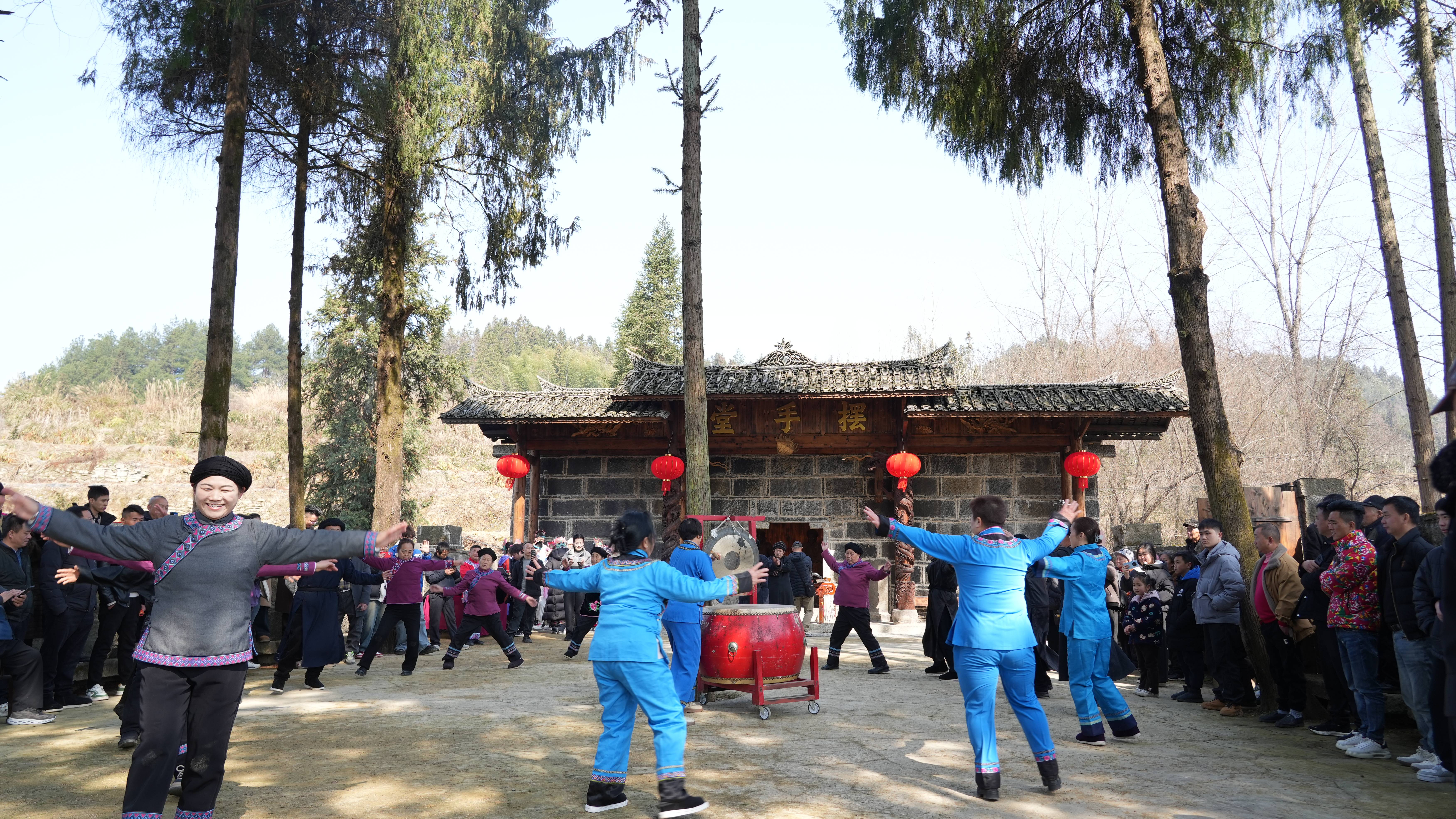 刚靠近舍米湖村村口的摆手堂,一阵清亮的土家山歌便拦住了来客的脚步——这是土家人最热情的拦门礼。“新的一年又来到,舍米湖村好热闹,我把山歌唱一首,大家身体都健康哟哦!”清脆的歌声伴着浓浓的年味,传递着土家人的热忱。