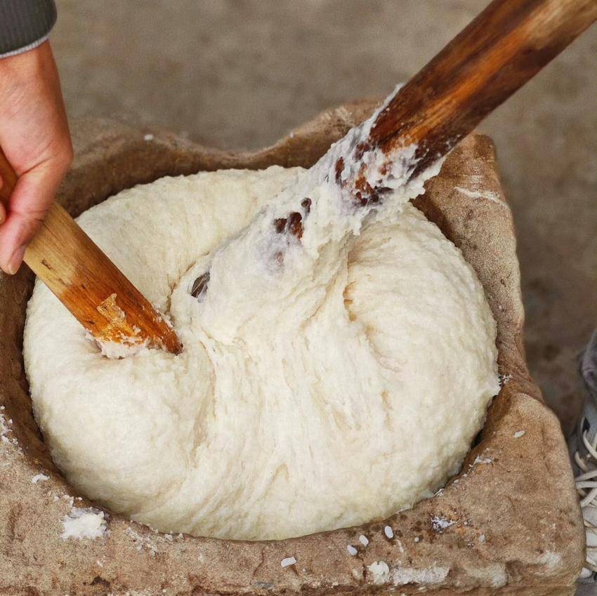打糍粑需要两种工具,放在地上的带凹槽的正方形石头器皿叫“地窝”,两根粗壮耐用的大木棒,叫杵棍。蒸好的糯米饭趁热倒入地窝,两名青壮年男子相对而立,手持杵棍轮番捶打。先轻碾慢揉,让米粒初步融合,再发力快打,讲究快、准、稳、狠,力道均匀才能打得瓷实绵密。打到中途还要默契配合“翻窝”,伴着整齐号子转动捣压,防止米粒夹生。直到糯米团柔韧拉丝、粘棍不掉,才算大功告成。整个过程既是体力活,更是技术活,乡亲们轮流上阵、互帮互助,欢声笑语回荡在院落里。