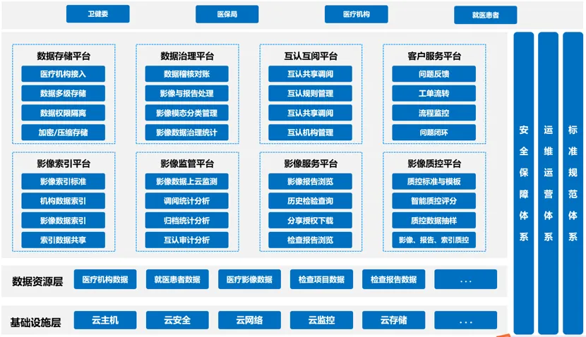 该平台具备数据存储、治理、索引、质控、服务、监管、互认互阅、客户服务八大核心功能,覆盖医疗影像全业务链条。例如,数据存储平台为影像跨机构调阅提供基础,数据治理平台对多源异构数据进行标准化处理,影像质控平台利用AI技术辅助审核拍片质量与报告规范性。
