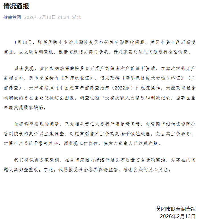黄冈通报“出生幼儿漏诊先天性脊柱畸形医疗问题”