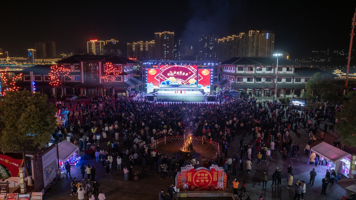 金鼓催春潮涌堵河,骏马奔腾福满竹山。2月12日晚,湖北竹山县桃花源街区女娲广场灯火璀璨、暖意融融,“我在竹山过大年”竹山县2026年春节村晚在这里盛大启幕。晚会汇聚歌舞、相声、戏曲、非遗、网红小品等多元节目,本土明星与专业演员同台献艺,线上线下同步直播,数万观众共赴一场年味浓、乡情真、接地气的新春文化盛宴。