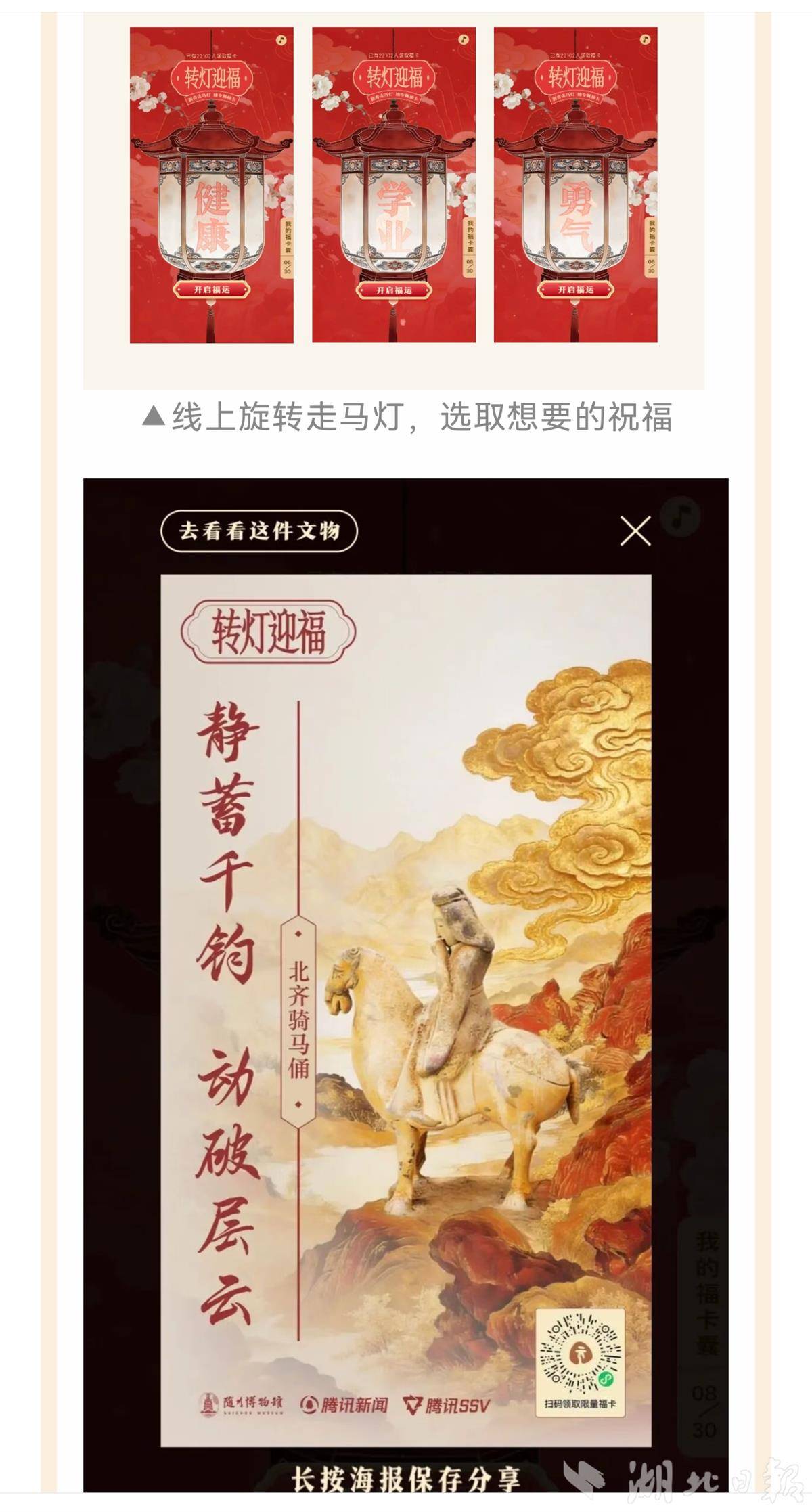 随州市博物馆举办“古韵今风·车马寻踪”主题研学活动,并与腾讯SSV数字文化实验室、腾讯新闻联合推出“新春走马灯”活动——通过线上抽福卡、馆内寻印记等方式,线上线下联动、让文物“活”起来。