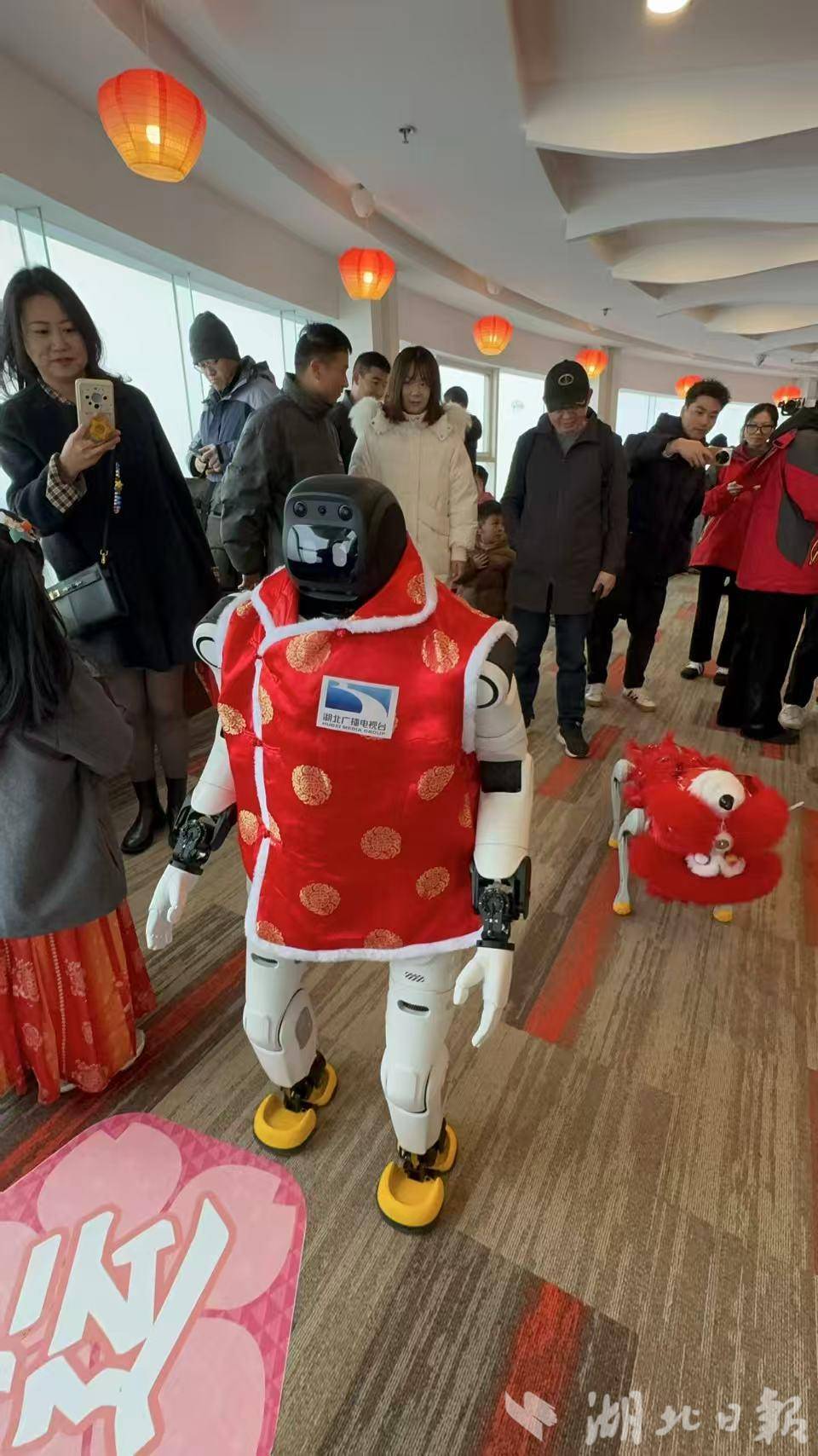 “骏马踏春,江城焕新。2026年,愿你登上龟山揽胜,如天马行空般自在。”在龟山电视塔观景平台,2名机器人行走游客中间,提供讲解、合照服务,并适时送上祝福,全程丝滑流畅。