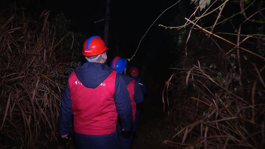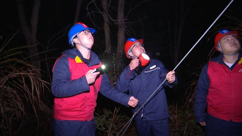 童子进一边清理拉线上的杂藤,一边向年轻同事解释。这样的夜巡,是他们春节前的日常。