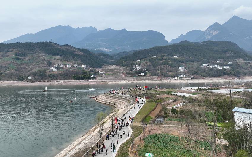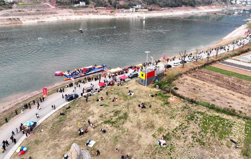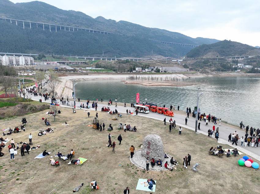 上午9时许,巴东县溪丘湾乡平阳坝村神农湖畔迎来一拨拨自驾游客,停车场一位难求。在环湖大道上,小吃店、水果摊位、新年饰品、空中观光、陆地小火车和观光车、水中快艇或荡舟或嬉戏、放风筝、自行车骑行、健步走、草坪娱乐、日光浴等等让人目不暇接,人气感直接拉满,每天游客接待量超5000人。