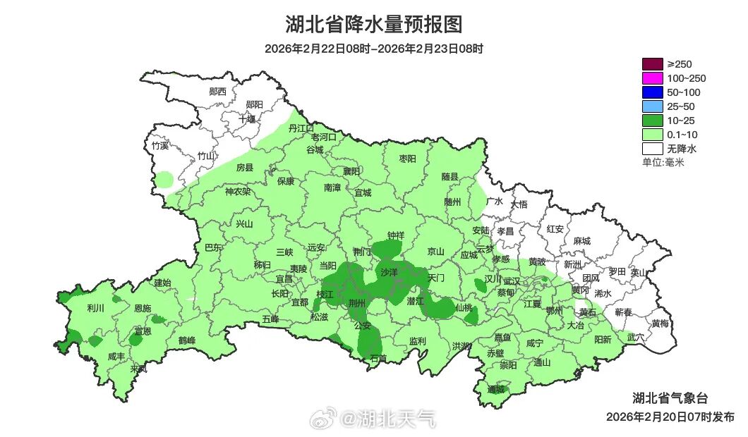2月22日08时-23日08时,白天全省晴天到多云;夜间鄂东北东部多云到阴天,其他地区多云转阵雨。最高气温19~24℃,最低气温鄂西北1~6℃、其他地区6~12℃,偏北风3到5级、阵风6到7级。