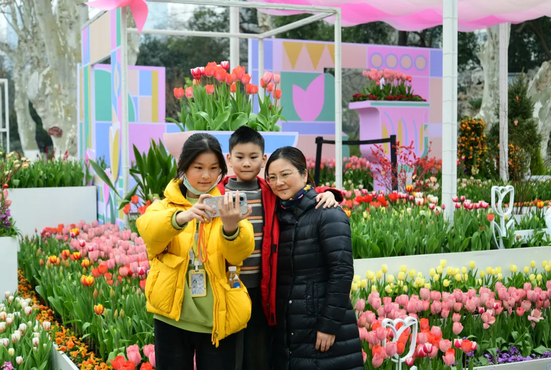 郁金香迎风摇曳,七彩角堇如彩虹铺展,紫罗兰、雏菊等吐露芬芳,成为市民拍摄全家福的热门背景。据统计,春节假期前4天,景区接待游客近6万人次。