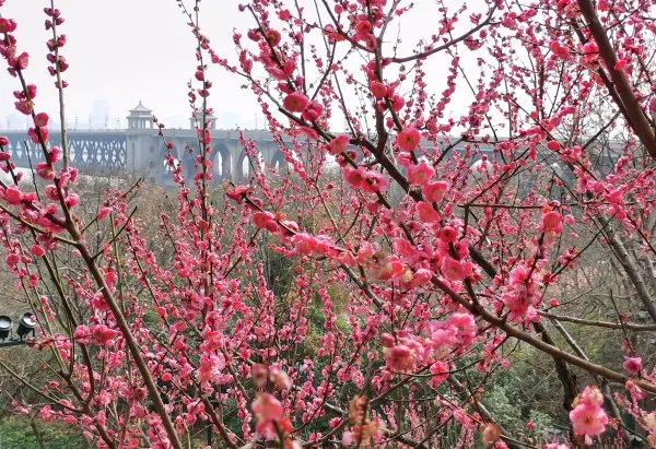 绽放的红梅与长江大桥同框。记者高勇 摄