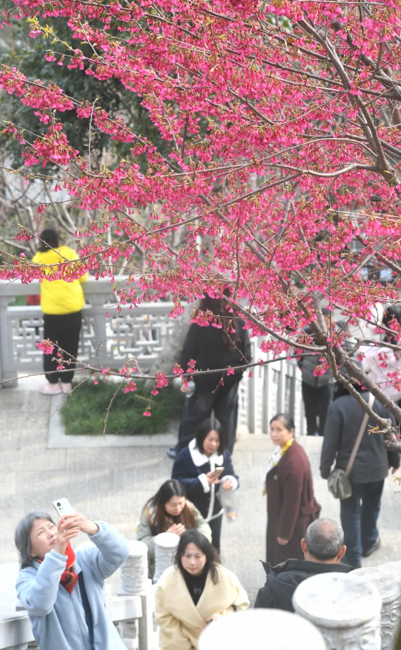 汉阳龟山公园绽放的钟花樱(又名“福建山樱”)引众多游客前来观赏。记者高勇 摄