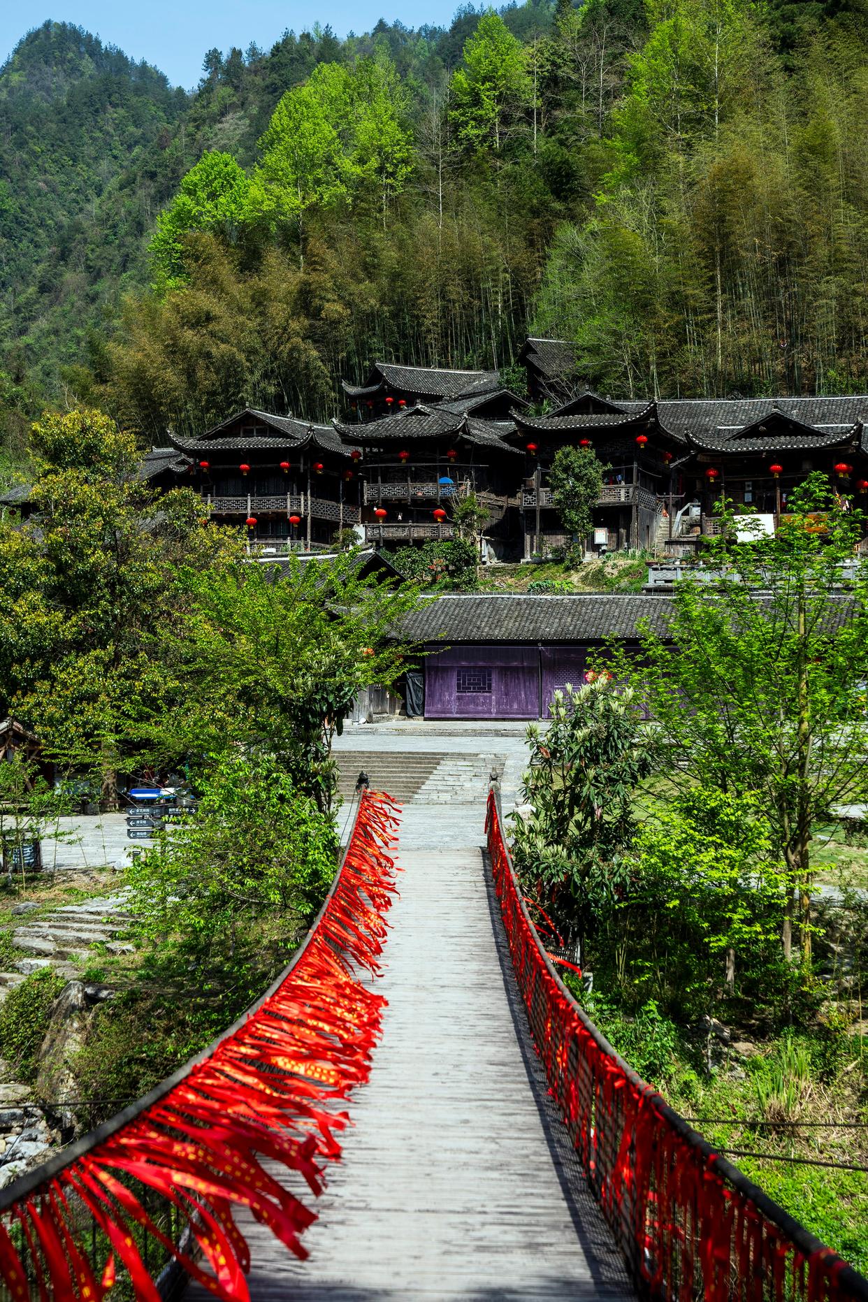 来到村中最具代表性、历史建筑保存最完好的彭家寨,远处随山势层叠错落的土家吊脚楼群映入眼帘。屋顶飘出的袅袅炊烟随清晨薄雾隐入山林,清澈见底的龙潭河缓缓流过。