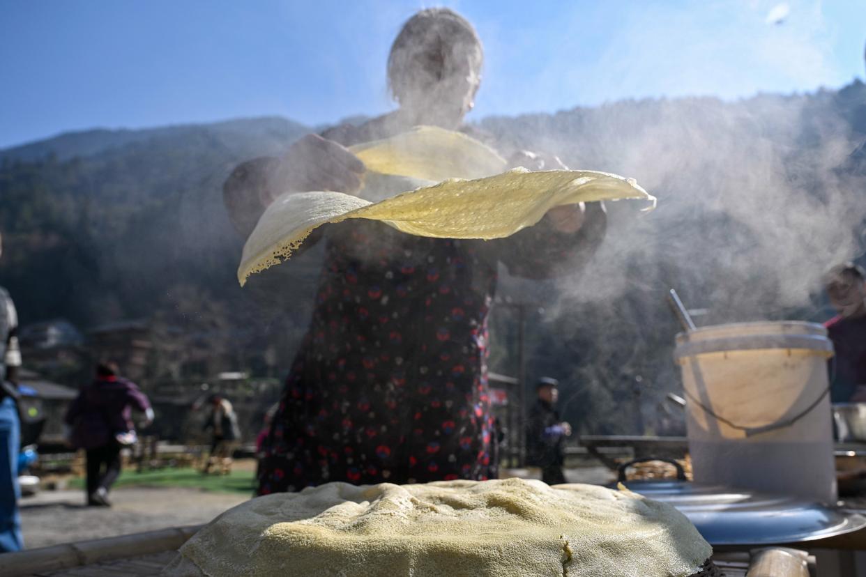 太阳渐高,晨雾散去。记者来到73岁的村民周友云家中,此时她正和家人一起烫豆皮。房前土灶上支着一口大铁锅,下面烧着柴火,周友云用“棕刷”沾上滴有油的水,在滚烫的锅底刷一下,大片的水蒸气立刻蒸腾起来。此时,她再麻利将提前备好的豆皮浆从外至内均匀涂抹,成形后翻上一面,不到半分钟,一张豆皮就烫好了。