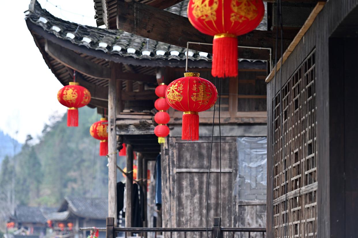 彭家寨吊脚楼挂上红灯笼。新华社发(陈绪开 摄)