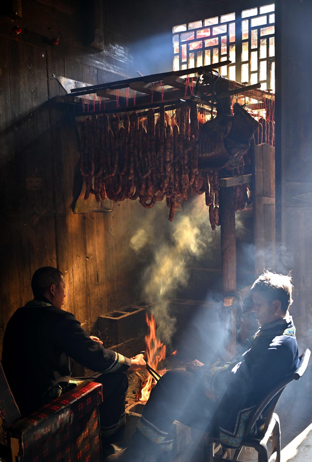 村民正在取暖和熏腊肉。新华社发(陈绪开 摄)