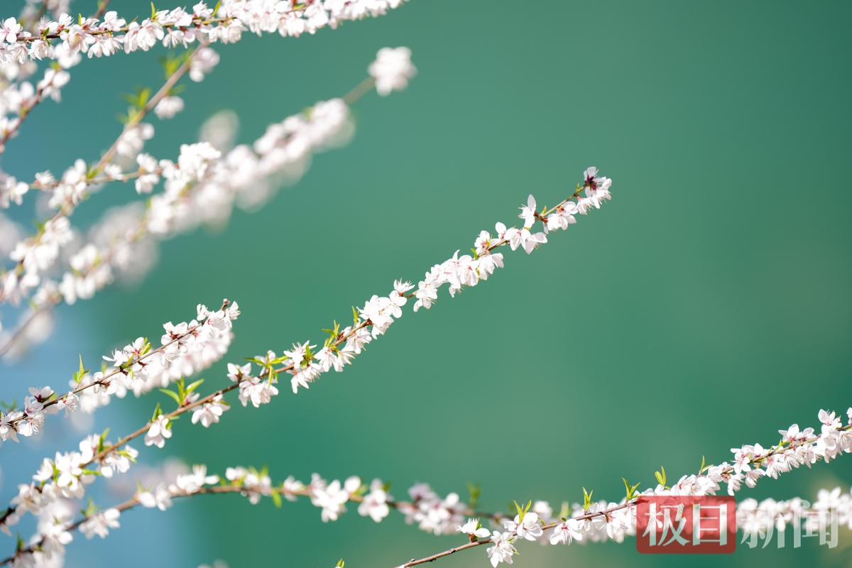 车窗外的山峦层层叠叠。不同于园林桃花的秾丽,散生于峭壁、岩隙的野桃花疏落有致、风姿天成。素雅的白花为主,间或点缀几树粉红,如珍珠洒落浩瀚绿毯,为巍峨山体平添几分俏皮生机。