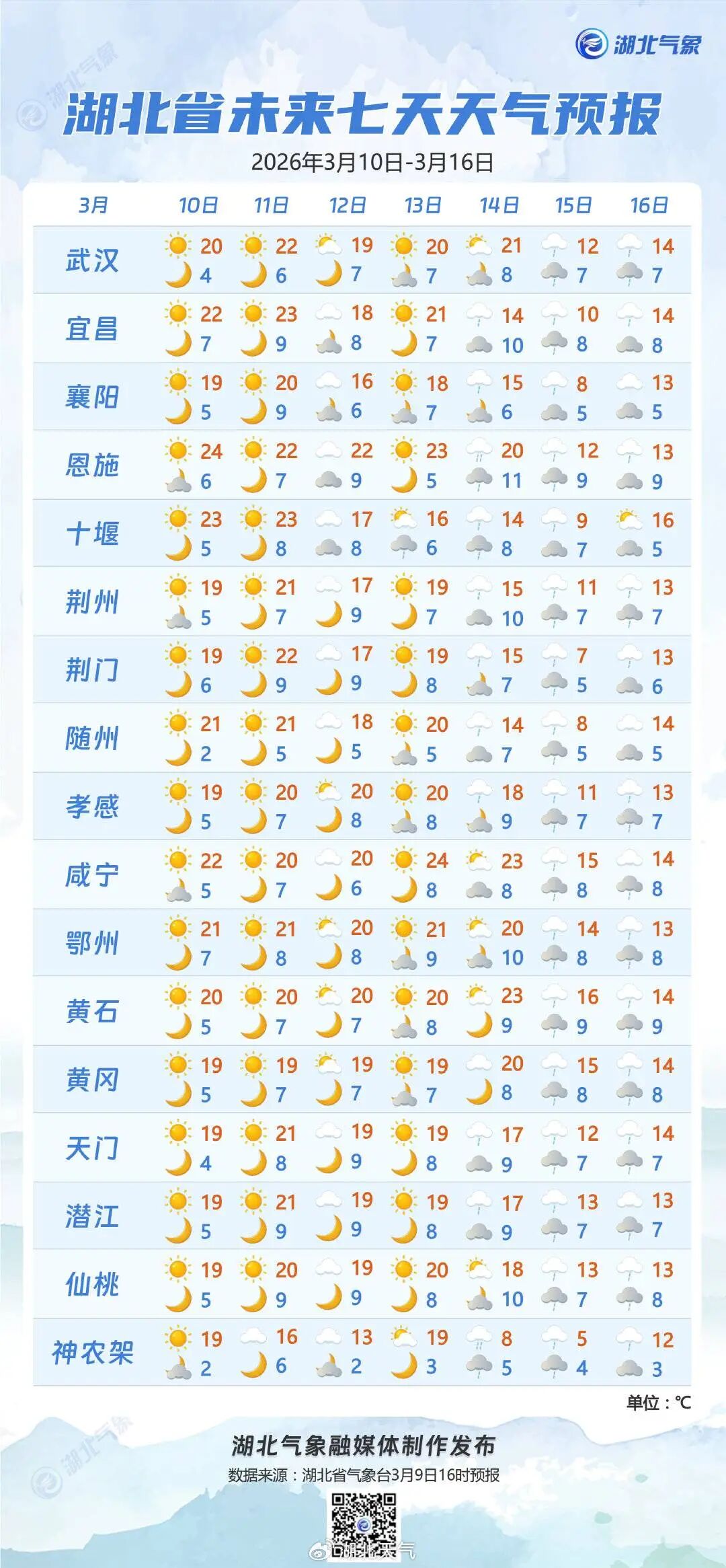 预报来源:湖北省气象台2026年3月9日16时预报