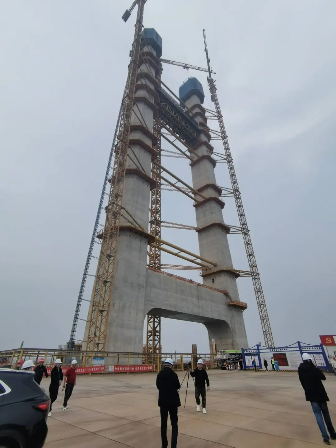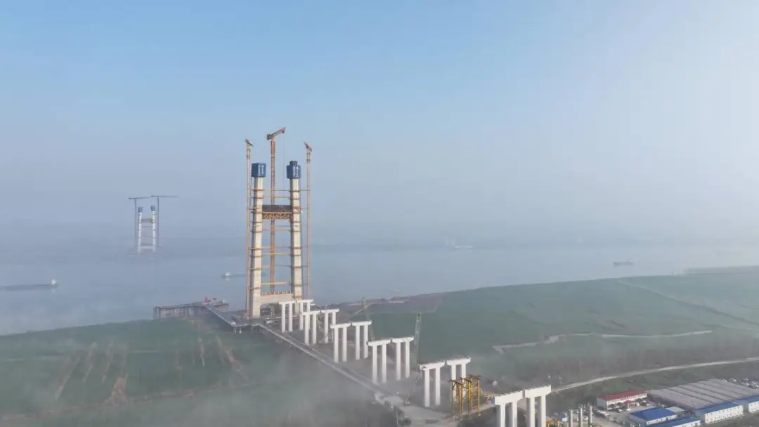 长江边浪花拍岸,工程车发出轰鸣声,脚下的钢栈桥面微微震动,黄色塔吊正在长臂挥舞吊装模板。仰视,两个主塔塔肢已“长”到60多层楼高。记者乘坐施工电梯花4分钟到达主塔施工平台,又弯腰爬了几层狭窄的铁梯,来到主塔平台,俯瞰大江两岸,壮美的油菜花地如调色盘般灿烂。