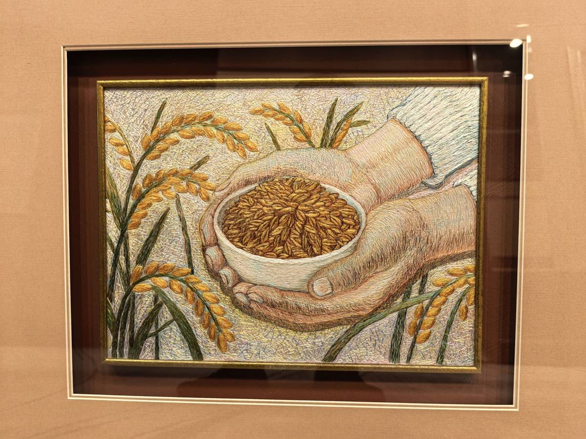 这幅汉绣作品,由湖北“美丽工坊”制作,满载着湖北“女粮王”毕利霞和乡亲们的感恩之情。2025年,湖北省粮食总产量达到558.24亿斤,连续13年稳定在500亿斤以上,实现“十三连丰”。今年全国两会期间,满怀丰收喜悦的全国人大代表、监利市精华水稻种植专业合作社理事长毕利霞,将这幅绣着金黄稻穗和金饭碗的汉绣作品带到了人民大会堂。多年奔忙在田间地头的毕利霞,种植水稻3920亩,还带动3800多户农民增产增收。富起来的乡亲们始终牢记着总书记“中国人的饭碗任何时候都要牢牢端在自己手中”的殷切嘱托,委托她将大家的心声带到北京。