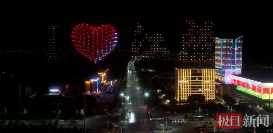 极目新闻记者在位于江陵县城的龙渊路看到,道路两旁的行道树被灯光装点得璀璨夺目。开幕式现场,百架无人机编队升空,在夜幕中排列成江陵铁牛、仙鹤楼等造型,吸引观众瞩目,拍照。当诗仙李白的名句“千里江陵一日还”字样闪耀在夜幕之中,现场观众不禁高声吟诵,现场气势如虹。