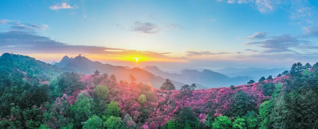 麻城龟峰山景区:万亩紫藤花和杜鹃花交相辉映,绝无仅有的高山万紫千红画面。花开时节,满岭红遍,红中透紫,红霞漫天,紫云升腾,花香扑鼻,呈现出红紫相间的奇妙画卷,堪称一绝!