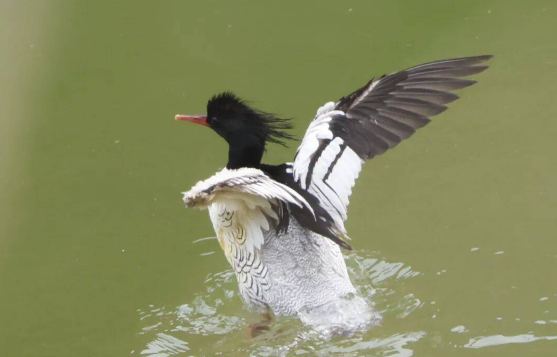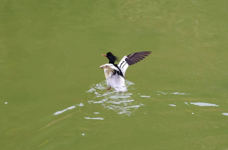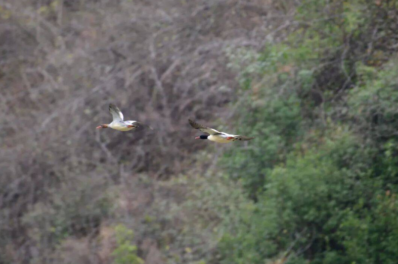 春和景明,碧波潋滟。荆山观鸟队在南河段开展鸟类监测时,拍摄到中华秋沙鸭与鸳鸯结伴游弋、嬉戏觅食的珍贵画面。