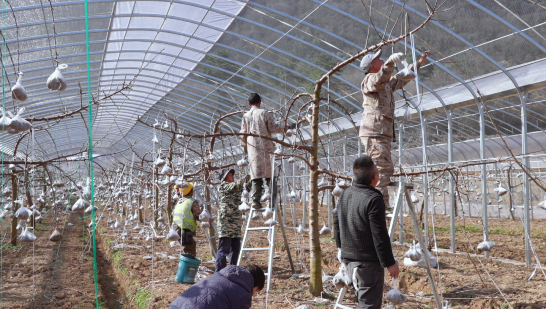 可能有朋友好奇,工人们整理枝条在做什么?其实这是车厘子的春季常规养护,简单来说就是调整树形,让每根枝条都能充分接受光照,为后续挂果打下基础。