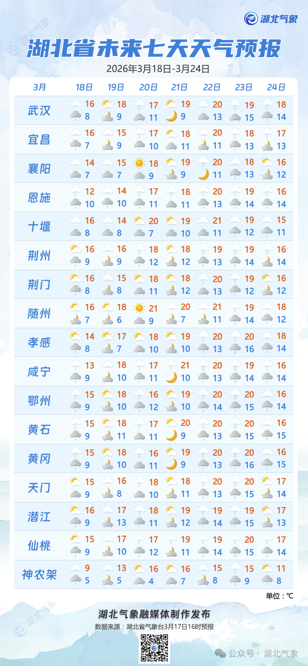 3月18日08时-3月19日08时,鄂西北零星小雨转阴天;其他地区小雨转阴天。最高气温恩施地区10~13℃、其他地区13~16℃,最低气温6~10℃,偏北风3到4级、阵风5到7级,夜间转2到3级。