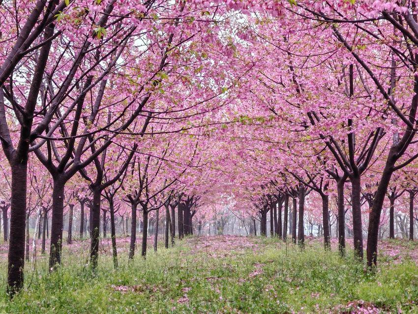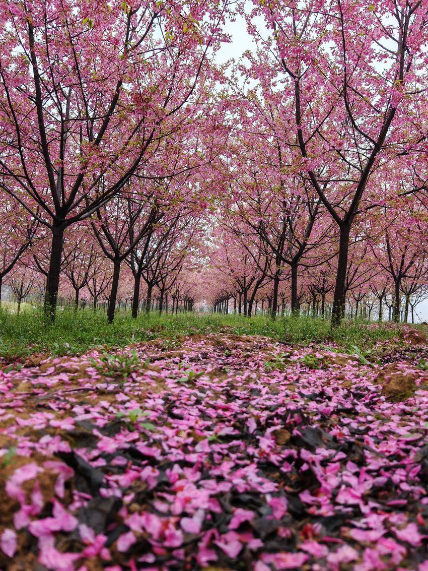 抬眼望去,满树繁花如云霞般绚烂,粉的、白的花朵交织在一起,在雨雾中若隐若现,恰似一幅晕染开来的水彩画。而树下,早已是落英缤纷,粉色的花瓣铺满了地面,如同给大地铺上了一层柔软的花毯。这一地残花与枝头的绚烂相互映衬,既有“落红不是无情物”的诗意,又有“花开堪折直须折”的热烈,将春日的生机与流转的时光完美融合。