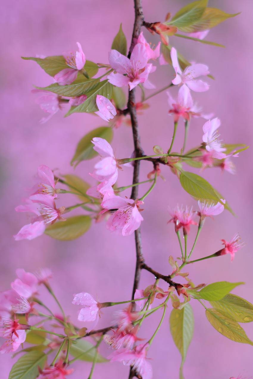 细雨纷纷,似天公抖落的珍珠,轻柔地吻过每一片花瓣、每一片绿叶。原本就粉嫩娇柔的樱花,经雨水浸润后更显晶莹剔透,宛如被大自然精心雕琢的美玉。圆润的水珠在花瓣边缘滚动,折射着朦胧的天光,仿佛镶嵌了细碎的钻石,一闪一闪,将春日的灵动与浪漫展现得淋漓尽致。微风拂过,花枝轻颤,水珠簌簌落下,在空中划出一道道优美的弧线,最终融入脚下的土地。