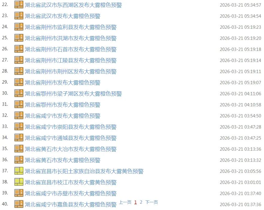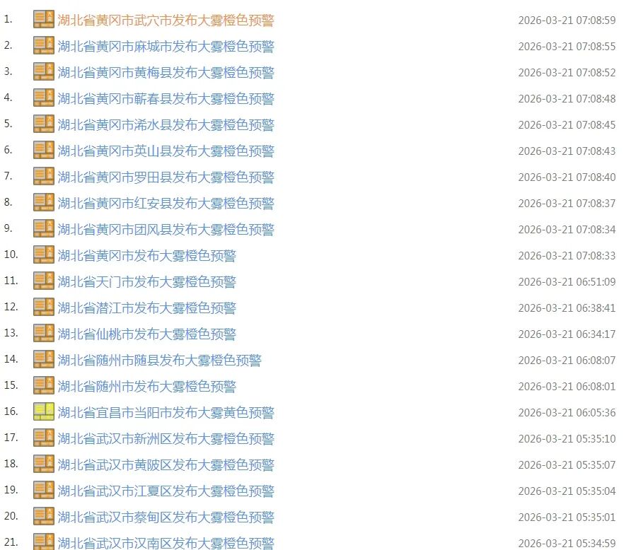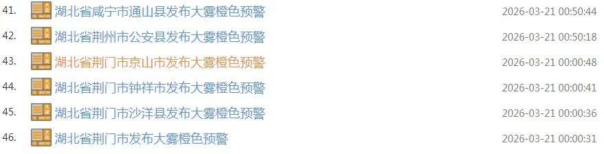 湖北连发46条大雾橙色预警