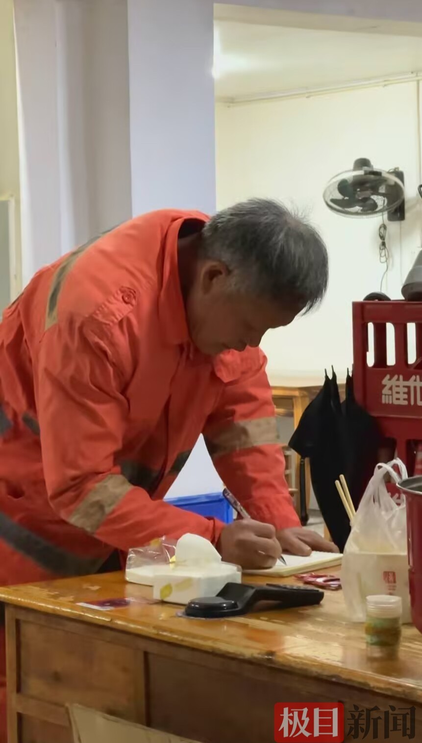 环卫工人在记账本上签名